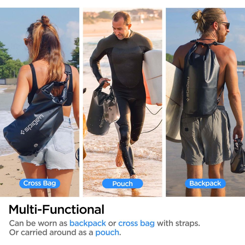 Funktionales Set aus zwei wasserdichten Taschen (20L und 2L) A630 von Spigen. Dank ihrer leichten und wasserdichten Konstruktion sind sie ideal für Wassersport, Wandern oder Camping. Das doppelte Verriegelungssystem sorgt dafür, dass die im Inneren gelagerten Gegenstände vor dem Eindringen von Wasser geschützt bleiben.