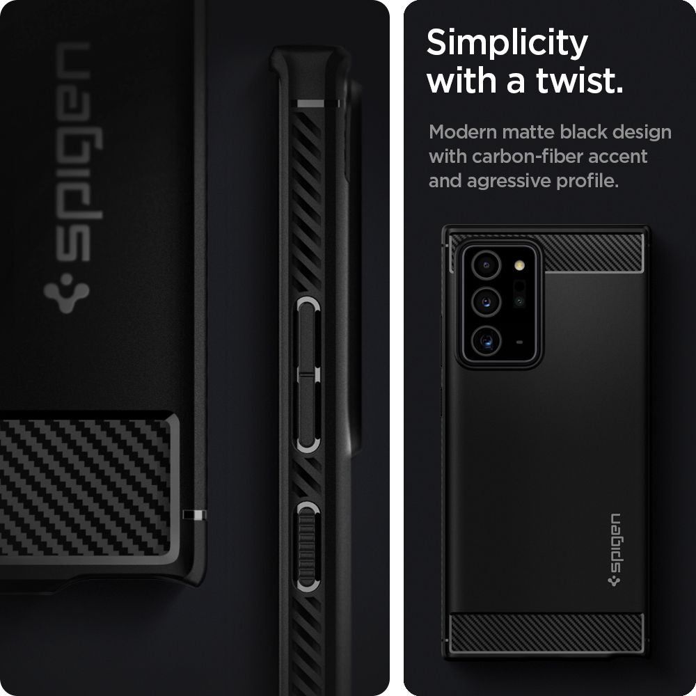 Die Rugged Armour Hülle von Spigen besteht aus weichem und strapazierfähigem, abriebfestem Thermoplast. Die Hülle passt perfekt zum Samsung Galaxy Note 20 Ultra und schränkt die Möglichkeit des kabellosen Ladens nicht ein.