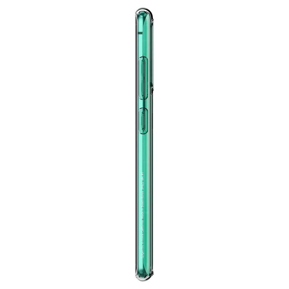 Die Ultra Hybrid Hülle von Spigen ist eine einteilige Hülle. Sie besteht aus einer transparenten Schicht aus Polycarbonat, die die Kanten und die Rückseite des Telefons abdeckt. Sie hat einen robusten Gummirahmen, der aus weichem thermoplastischem Material hergestellt ist und das Gerät zusätzlich vor Stürzen schützt. Die Hülle beeinträchtigt nicht die Möglichkeit des kabellosen Ladens.