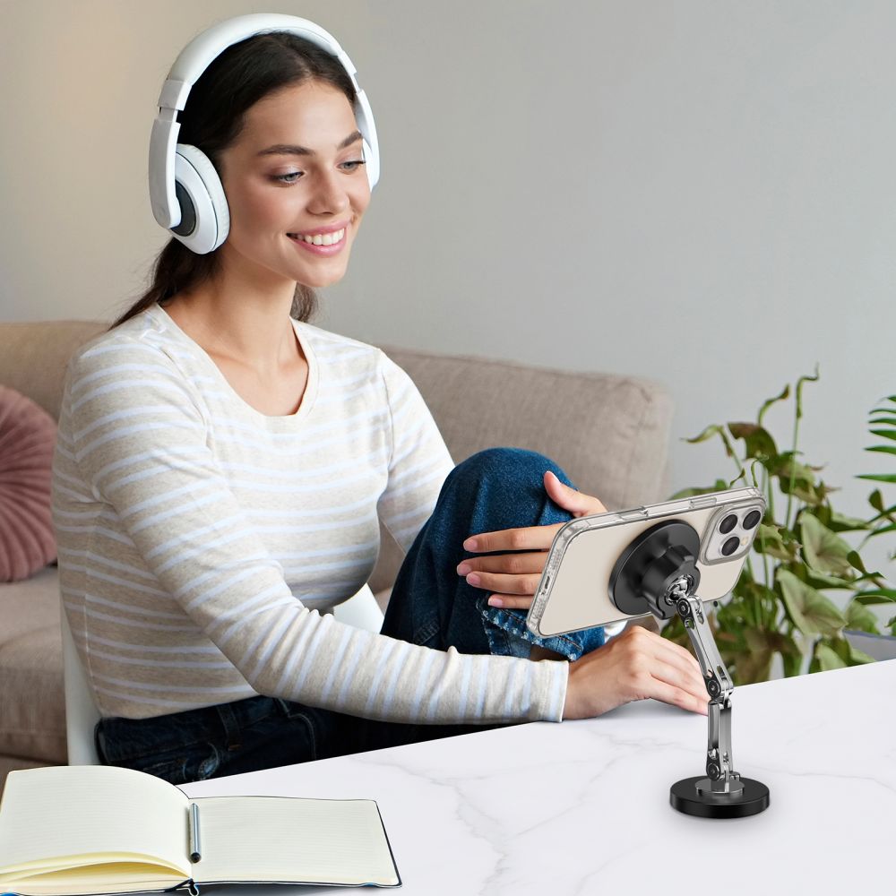 Hergestellt aus hochwertiger Zinklegierung und ABS-Kunststoff, zeichnet er sich durch außergewöhnliche Langlebigkeit und Widerstandsfähigkeit im täglichen Gebrauch aus. Der verstellbare Arm und die Gelenke ermöglichen es, den Neigungswinkel des Telefons anzupassen, wodurch optimale Sichtbarkeit und Komfort bei der Nutzung gewährleistet werden.